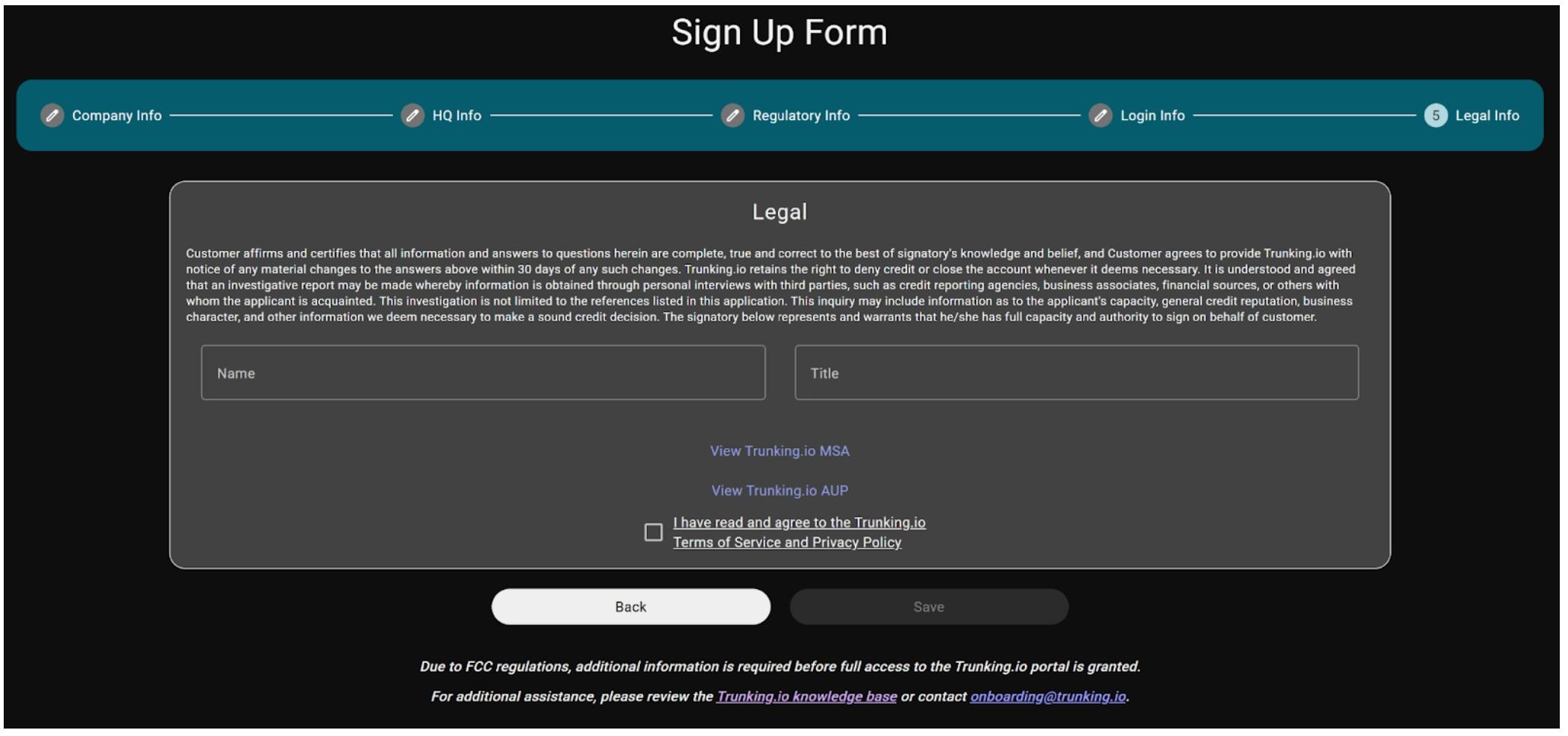 Legal Page: finally, review the Trunking.io Terms of Service and Privacy Policy carefully, as it outlines the legal obligations and responsibilities of both Trunking.io and your company. If you agree with the terms, please finalize the registration by entering your name and title to complete the legal agreement.