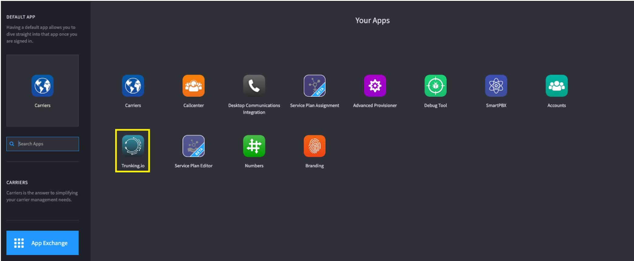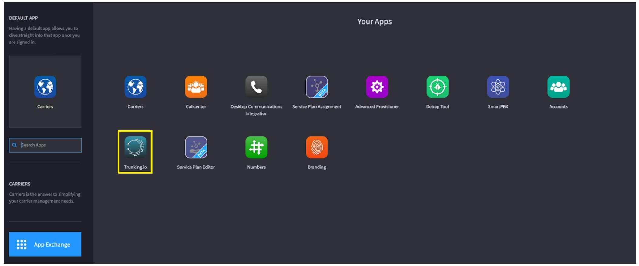 To begin, find the Trunking.io application on the 2600Hz platform.