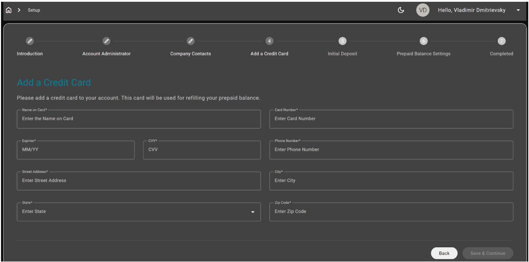All the following pages are related to the credit card setup.