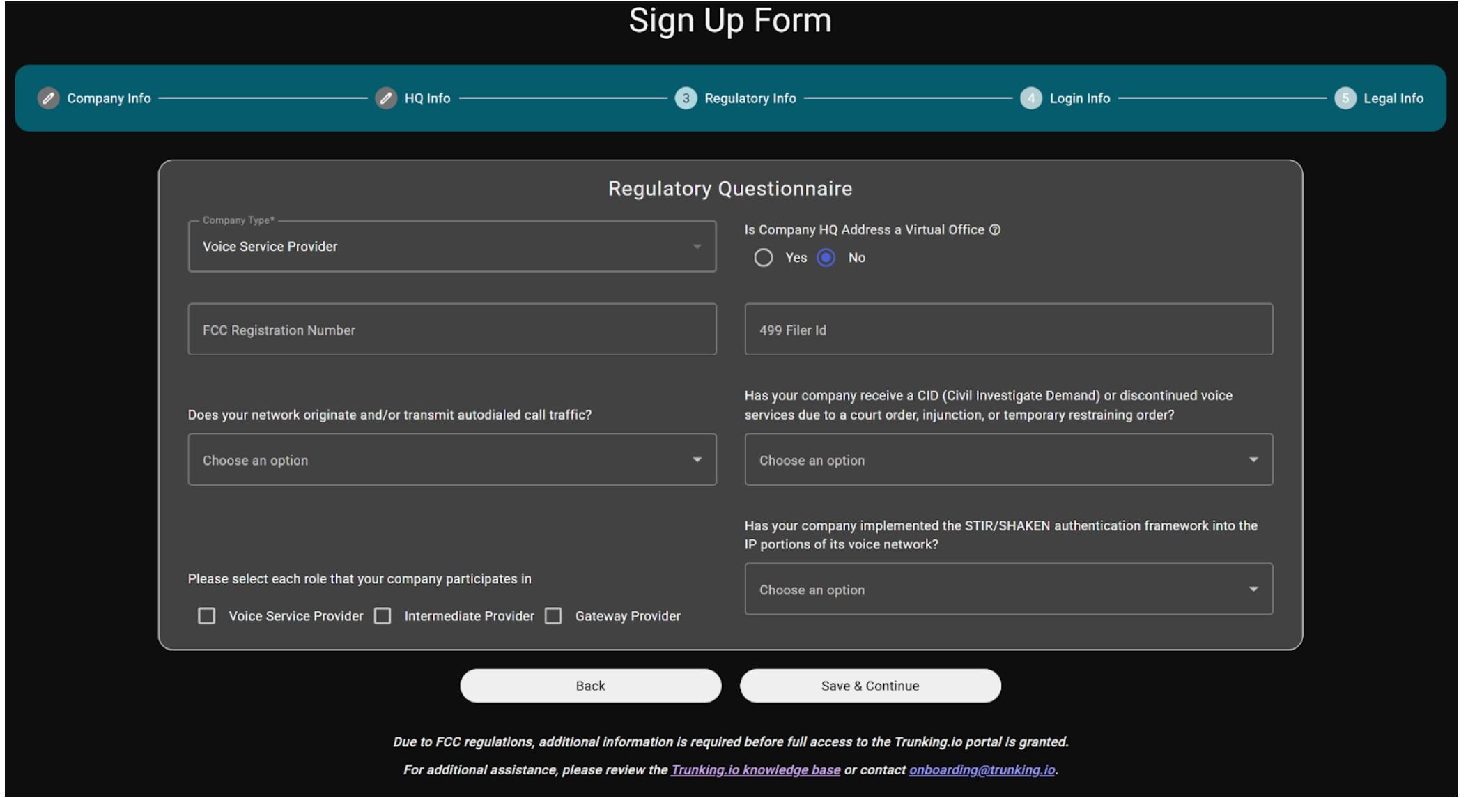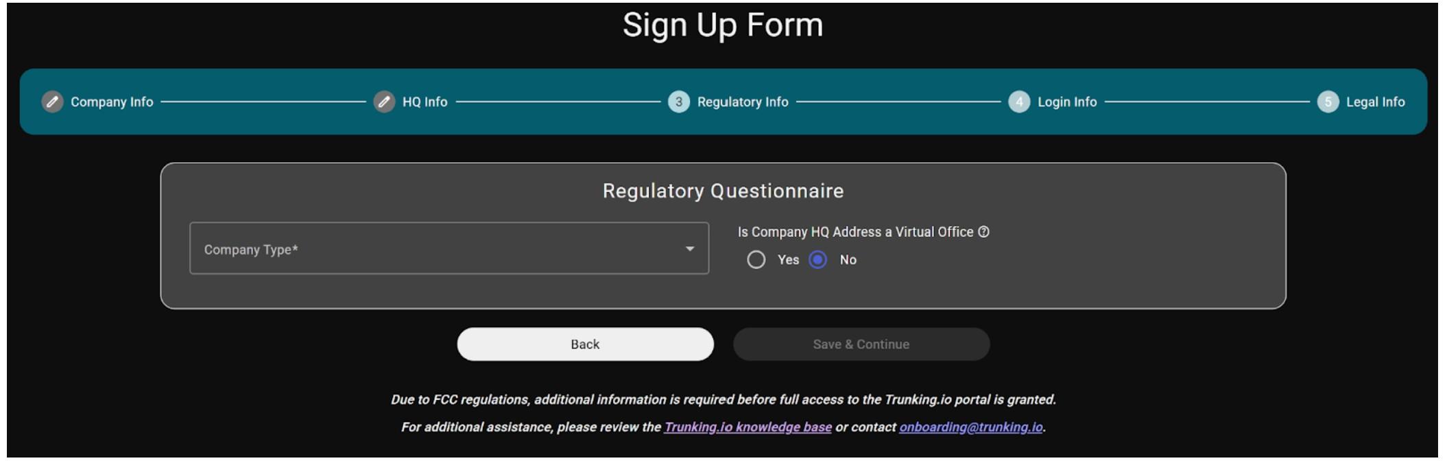 Regulatory Info: on this page, you specify the company type (e.g., voice service provider, private user, or government user) and indicate whether the HQ address is a virtual office.