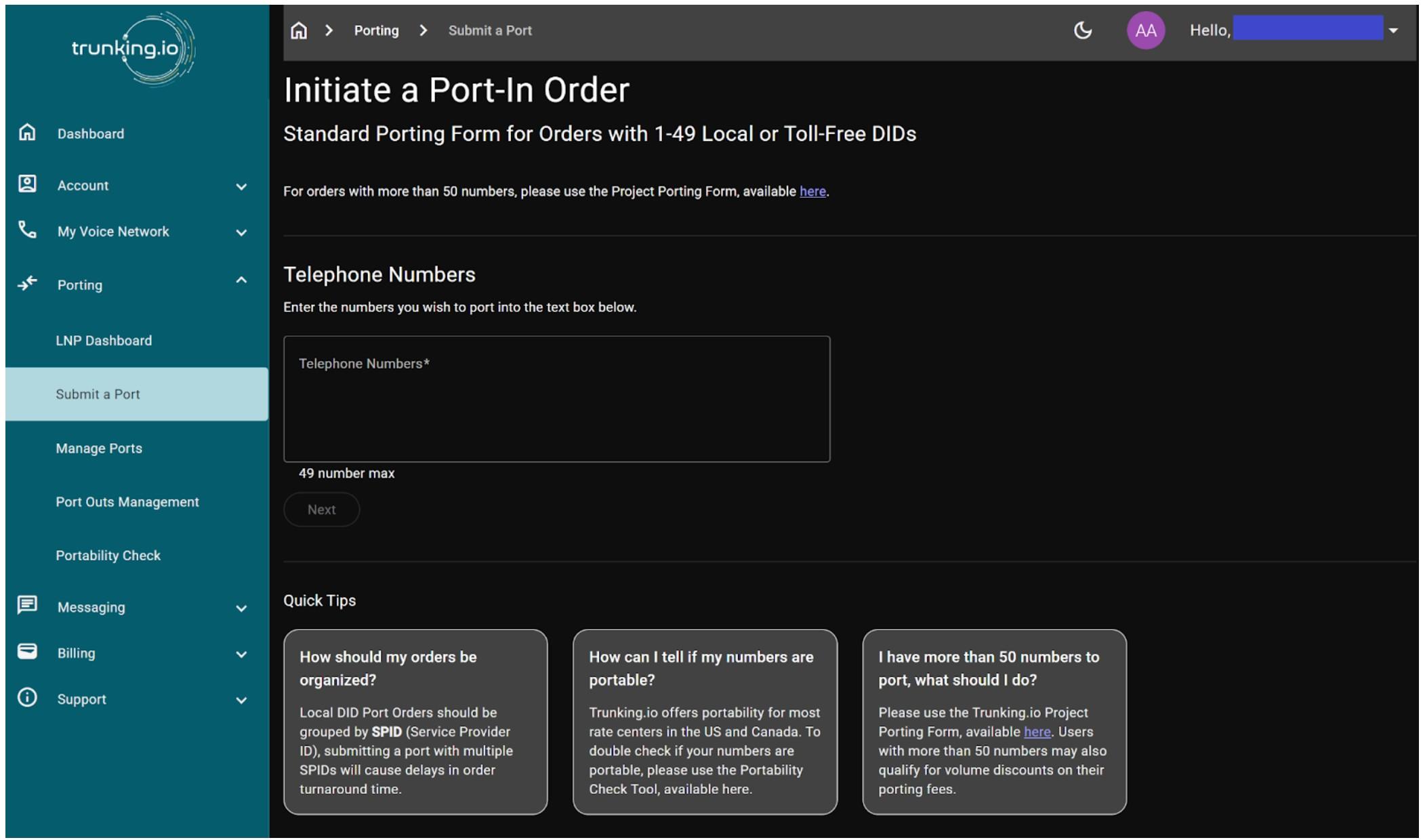 Submit a Port: here, you can submit a request to move customer owned DIDs to Trunking.io.