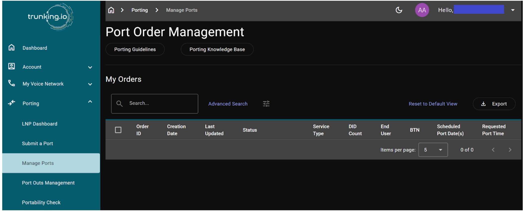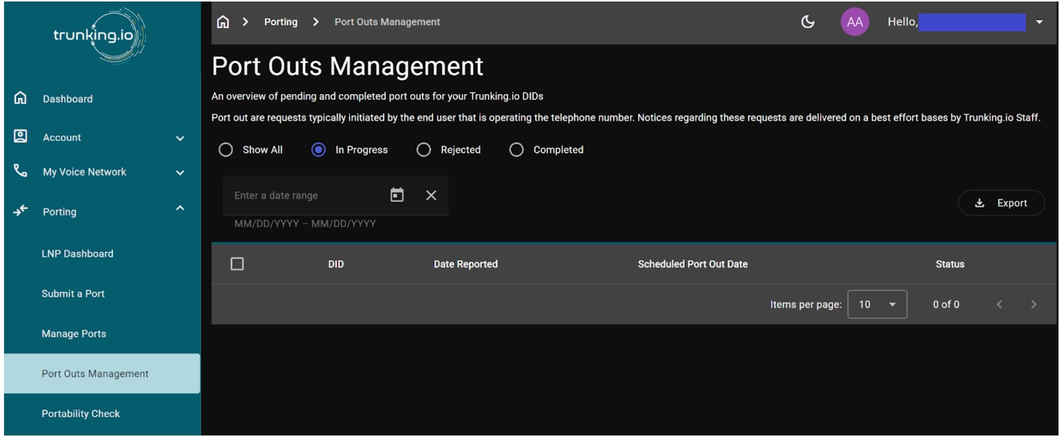 Port Out Management: here, you can find a table that provides an overview of all pending and completed “port out” requests for your Trunking.io DIDs.