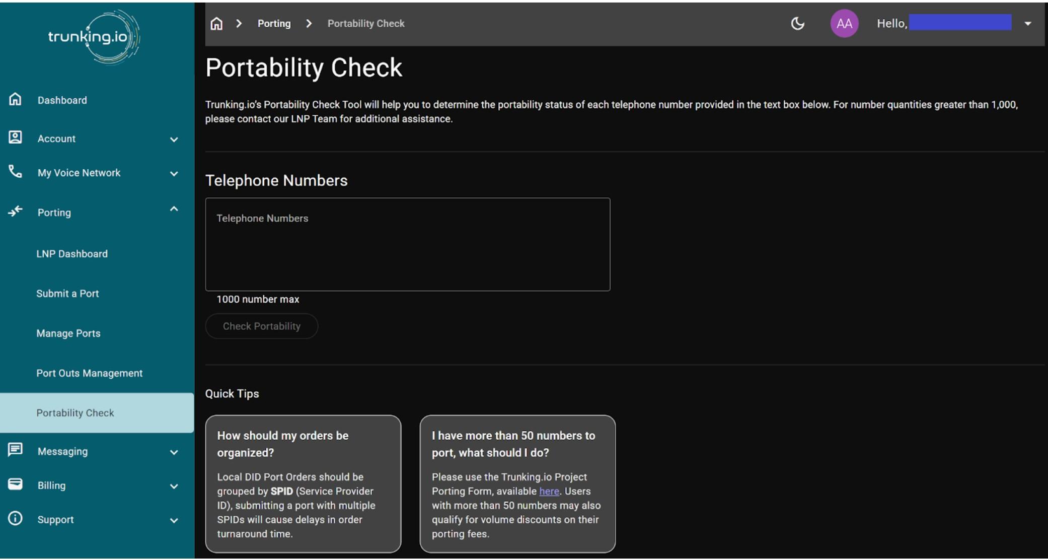 Portability Check: use this section to verify if a number can be transferred within Trunking.io’s network.