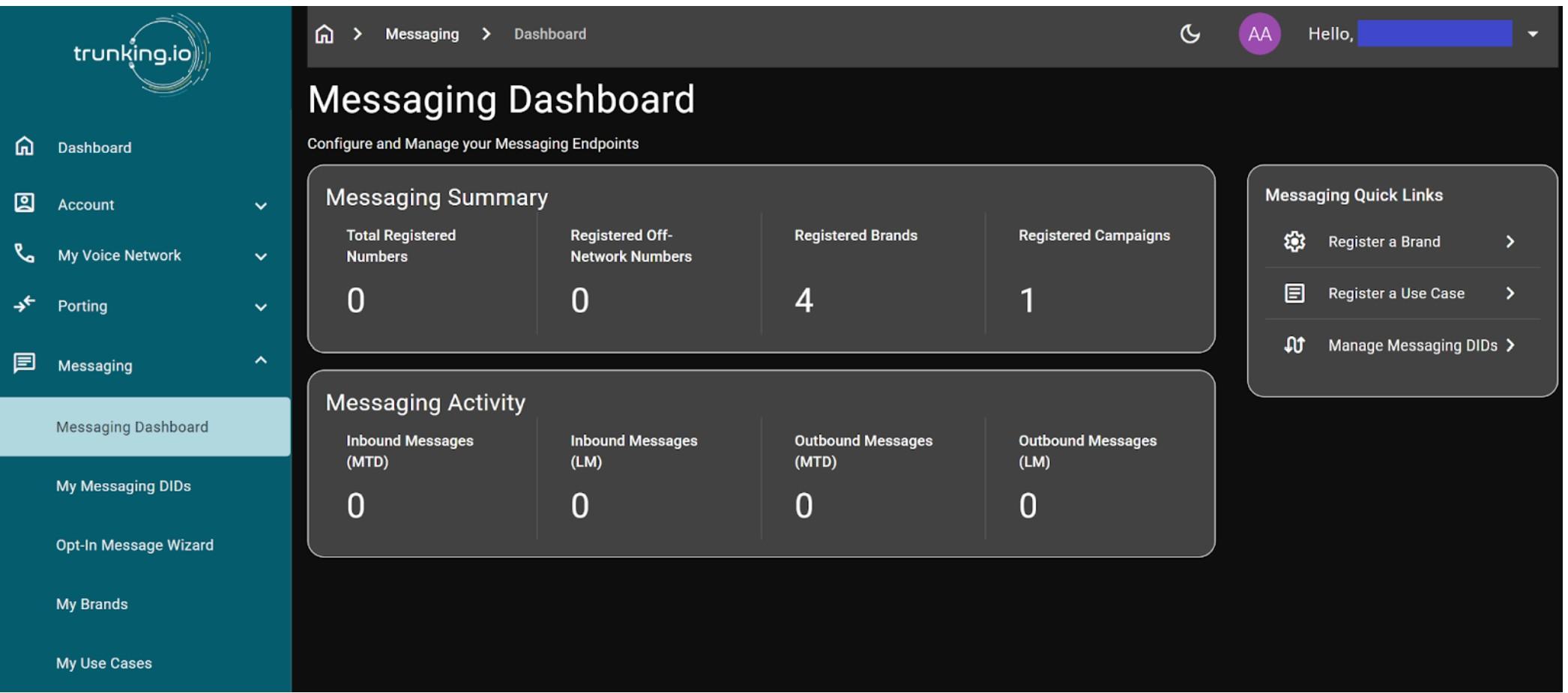 Messaging Dashboard: here, you can find an interface that provides an overview of messaging activity for registered numbers, brands, and campaigns, allowing users to track message delivery, monitor campaign performance, and manage messaging configurations in one place.