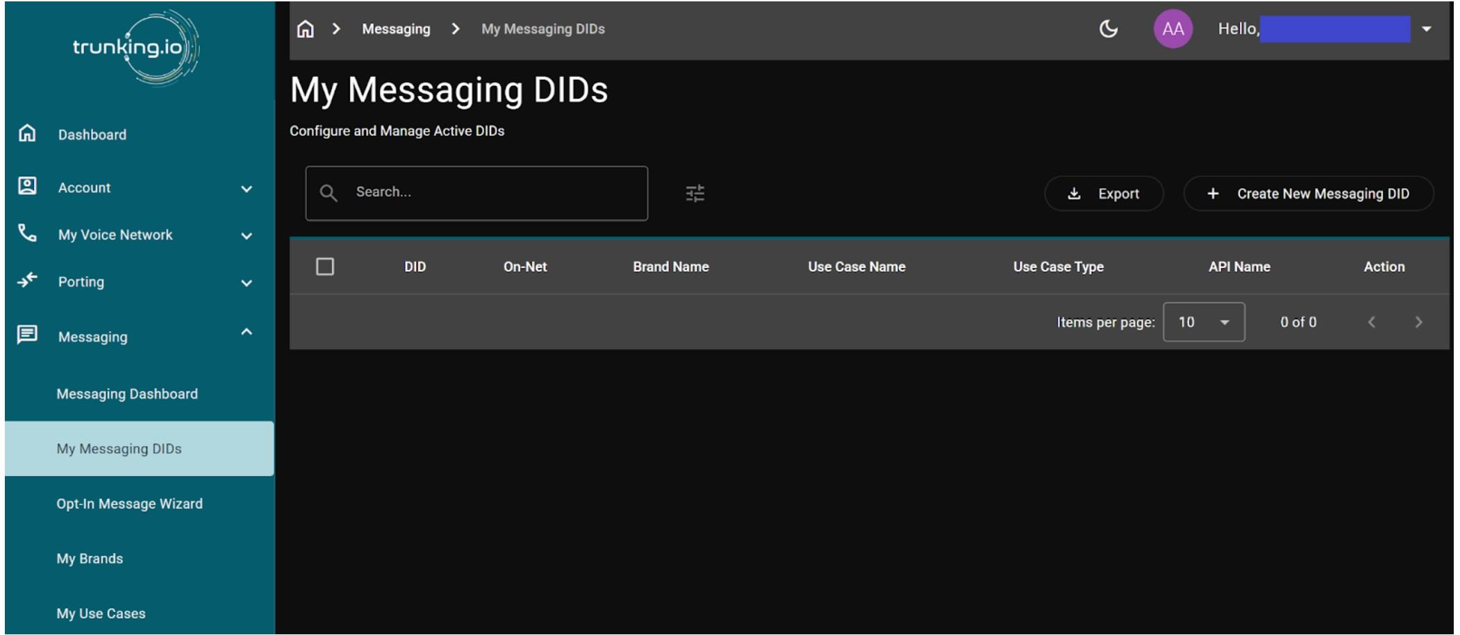 My Messaging DIDs: here, you can manage all active DIDs that currently have the messaging feature enabled. You can also add or remove numbers from approved Campaigns.