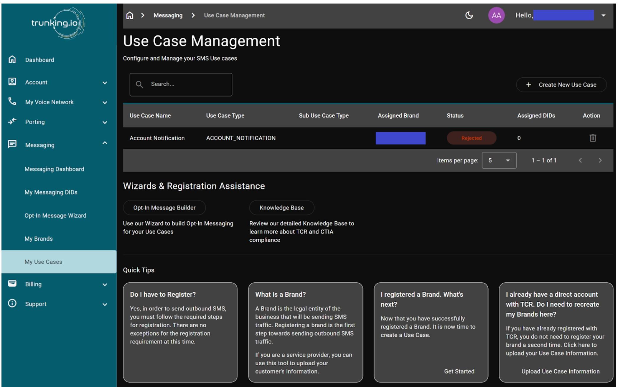 My Use Cases: here, you can configure and manage your SMS use cases based on the successful brand Campaign registrations completed in the “My Brands” tab.