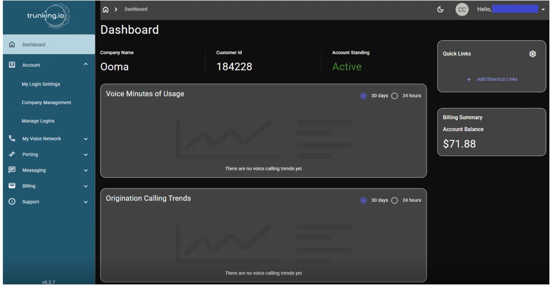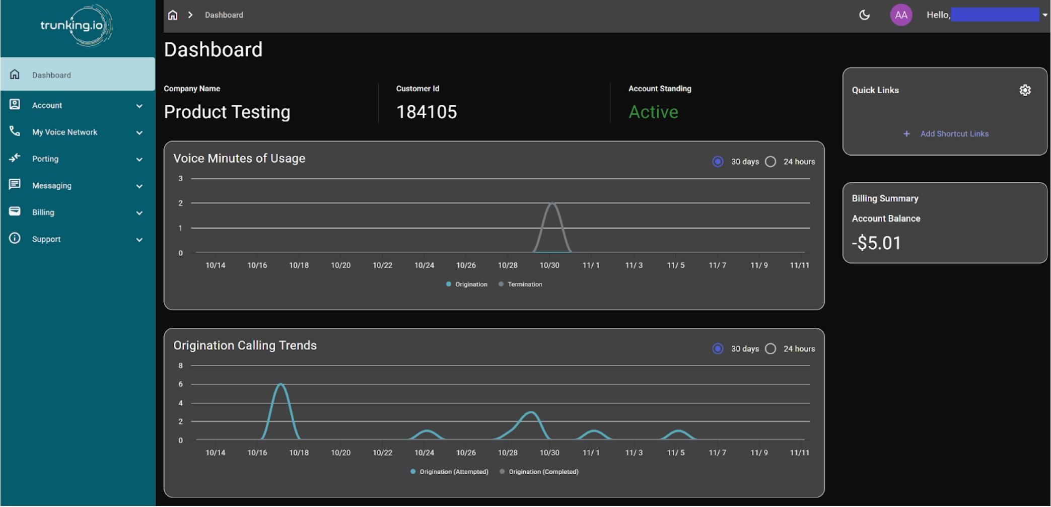 Dashboard: provides you with an overview of your Trunking.io account. This includes calling statistics, account standing status, and account balance information.