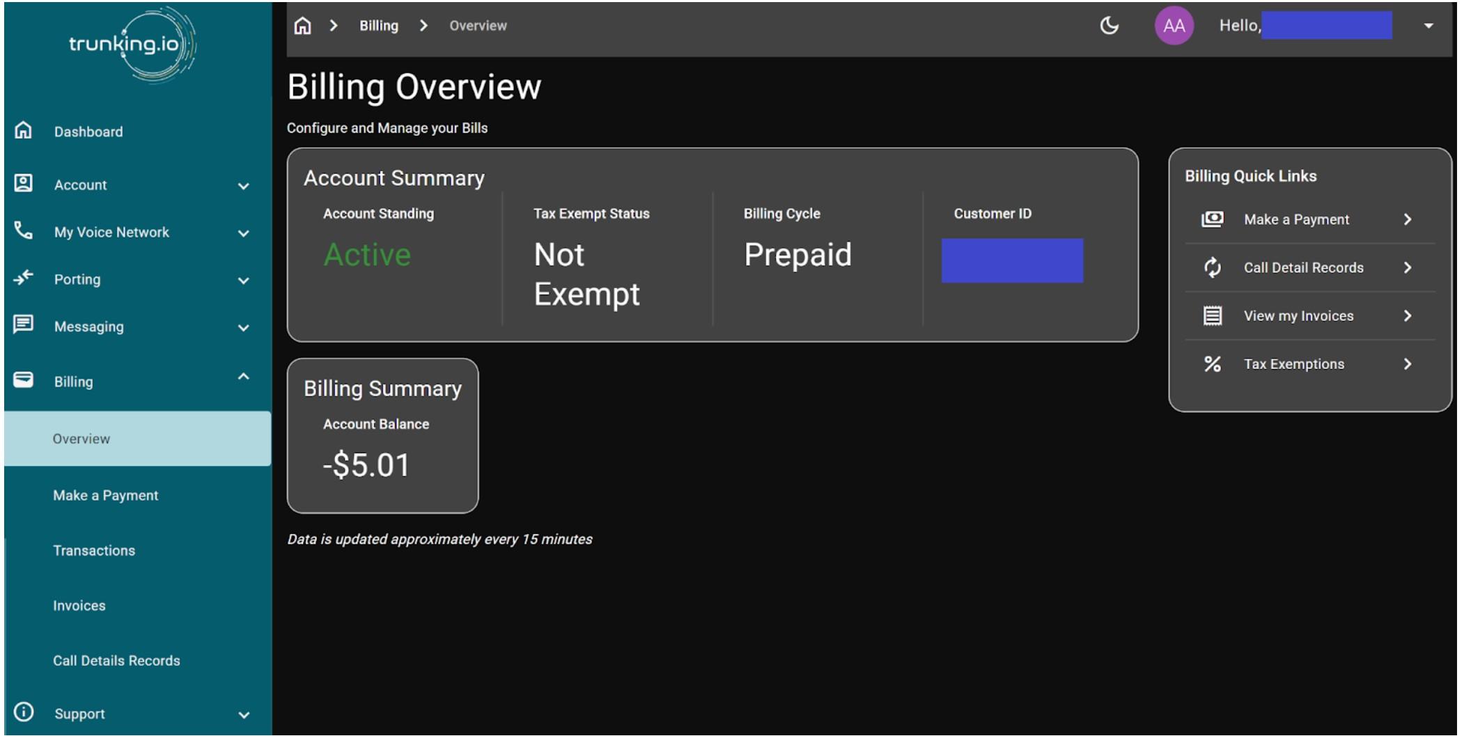 Overview: here, you can find an account summary and quick access to billing-related actions, such as viewing invoices, checking call detail records, making payments, and applying for tax exemptions.