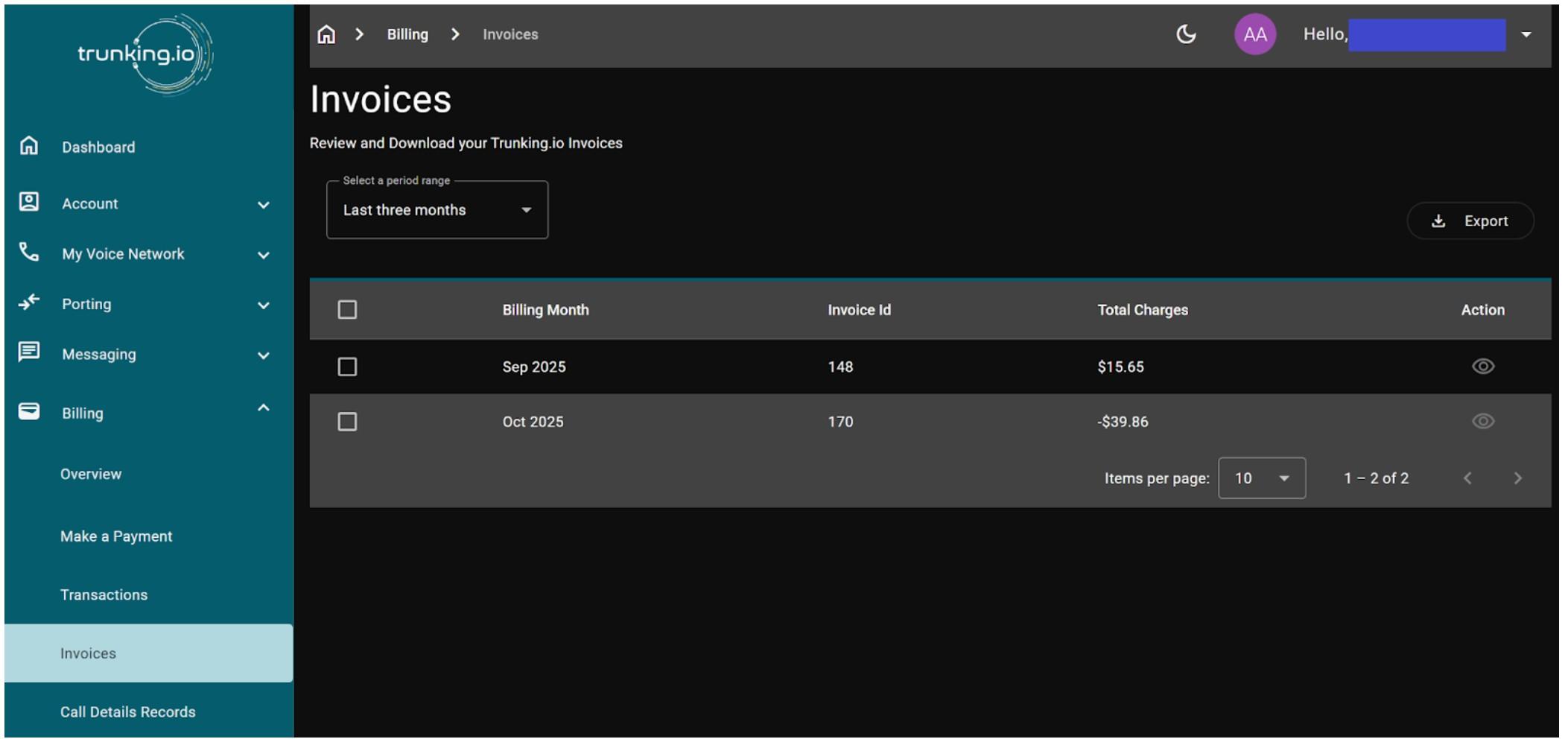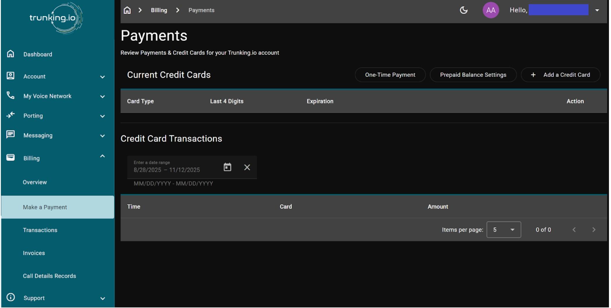 Transactions: here, you can find a summary of billing transactions that have been applied to your Trunking.io Account.