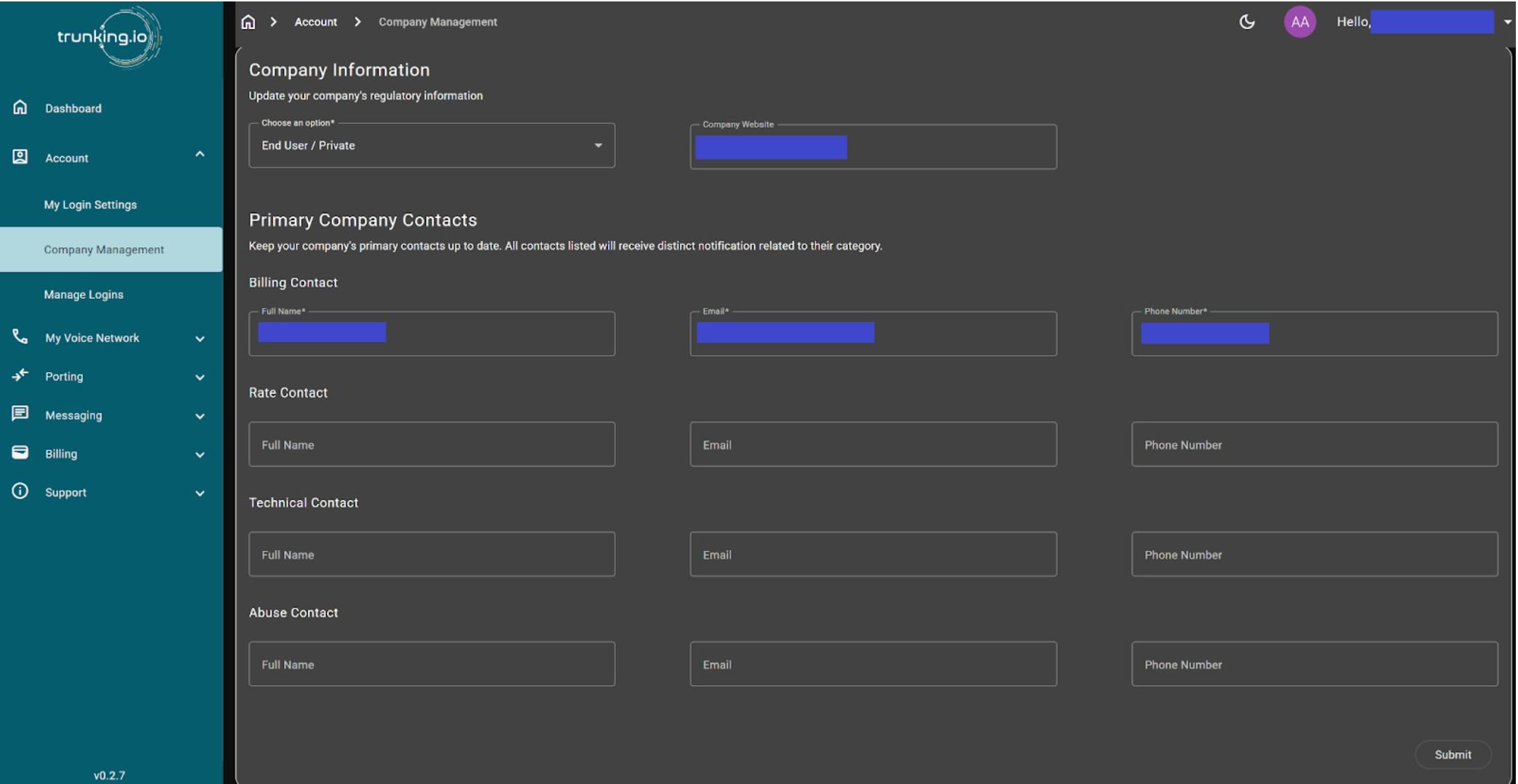 Company Management: in this section, you can edit your account administrator and company details. This page is also used to upload your STIR/SHAKEN certificate.