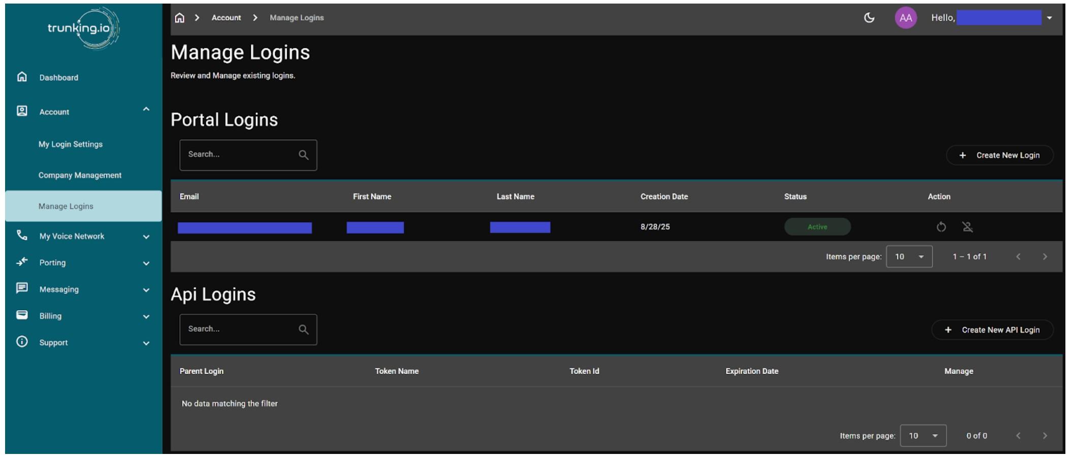 After accessing Trunking.io portal using the Trunking.io app in your 2600Hz Platform Admin app, you will gain access to the Self-Service Portal.