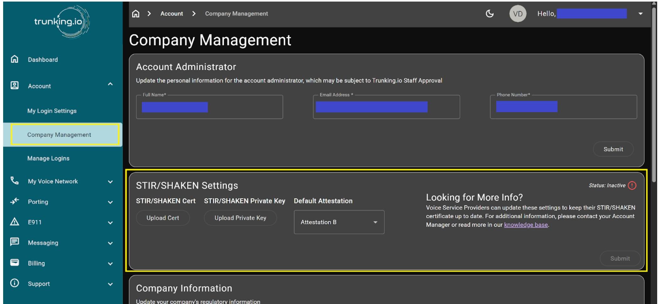 To upload the STIR/SHAKEN certificate and public key you received from your Certificate Provider earlier, expand the Account menu on the left-hand side of the portal and select the Company Management tab. On the page that opens, locate the STIR/SHAKEN Settings section.