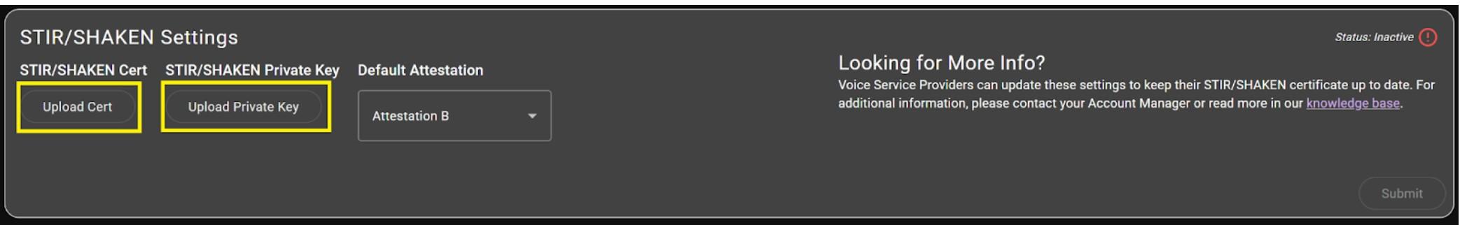 Once you upload your STIR/SHAKEN certificate, Trunking.io will begin signing their calls with that certificate within a couple of minutes. The verification process is almost instantaneous upon upload. Once your service is activated, you’ll receive an email notification. At that time, your outbound calls will be switched over, but inbound calls will not be affected.