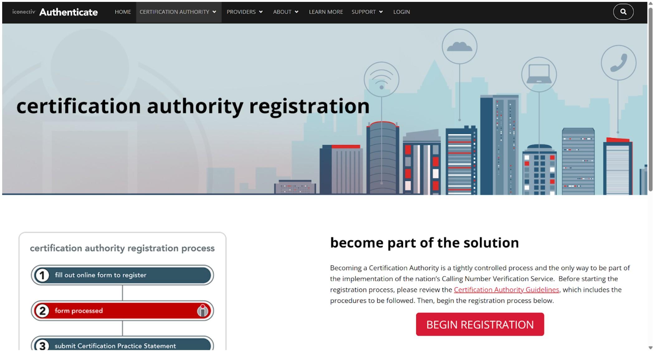 Next, complete the STI-PA registration by visiting the iconectiv Authenticate website and navigating to the Provider Registration page. On this web page, you’ll see a diagram outlining the overall process. Once you’ve reviewed it, click the “Begin Registration” button to get started.