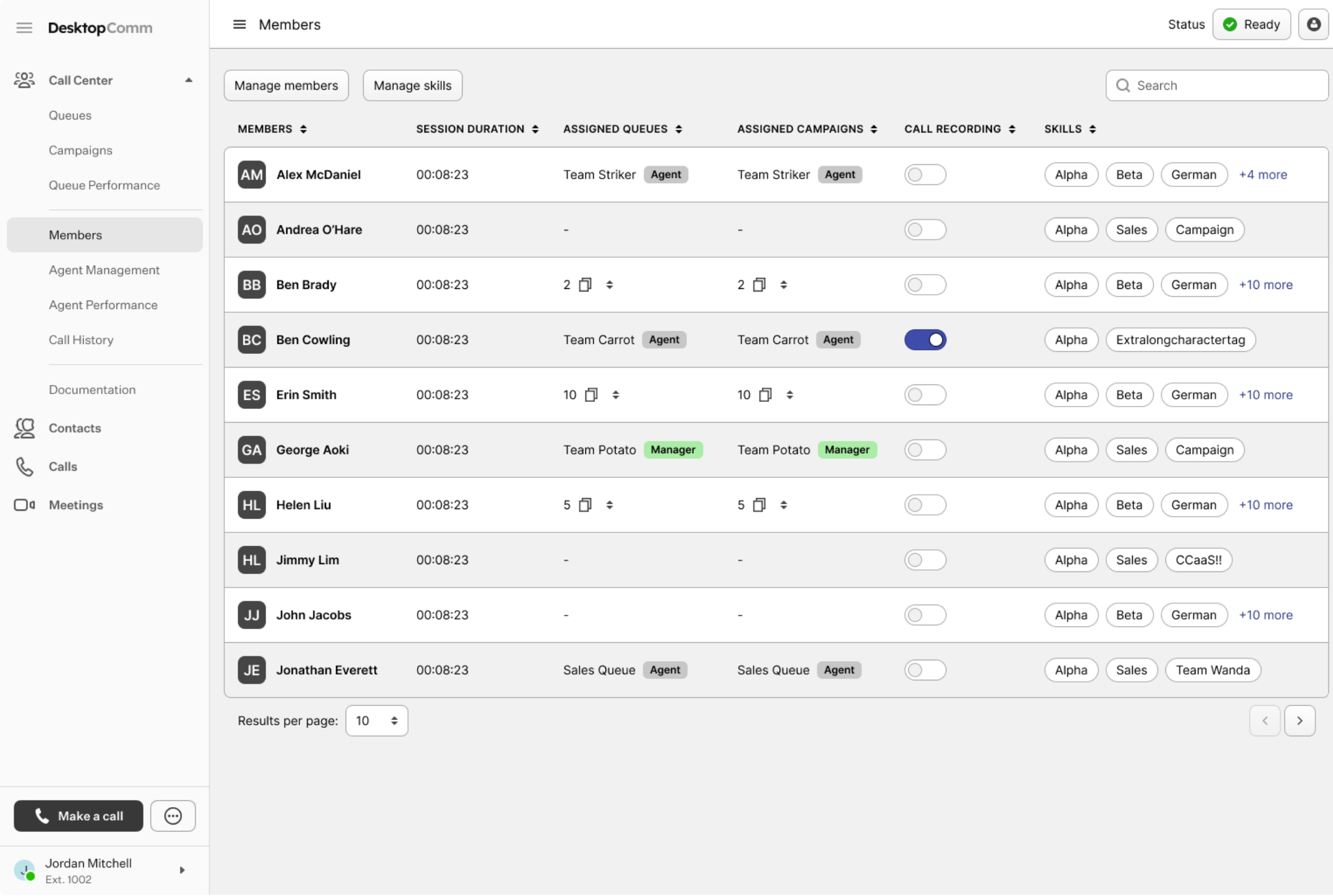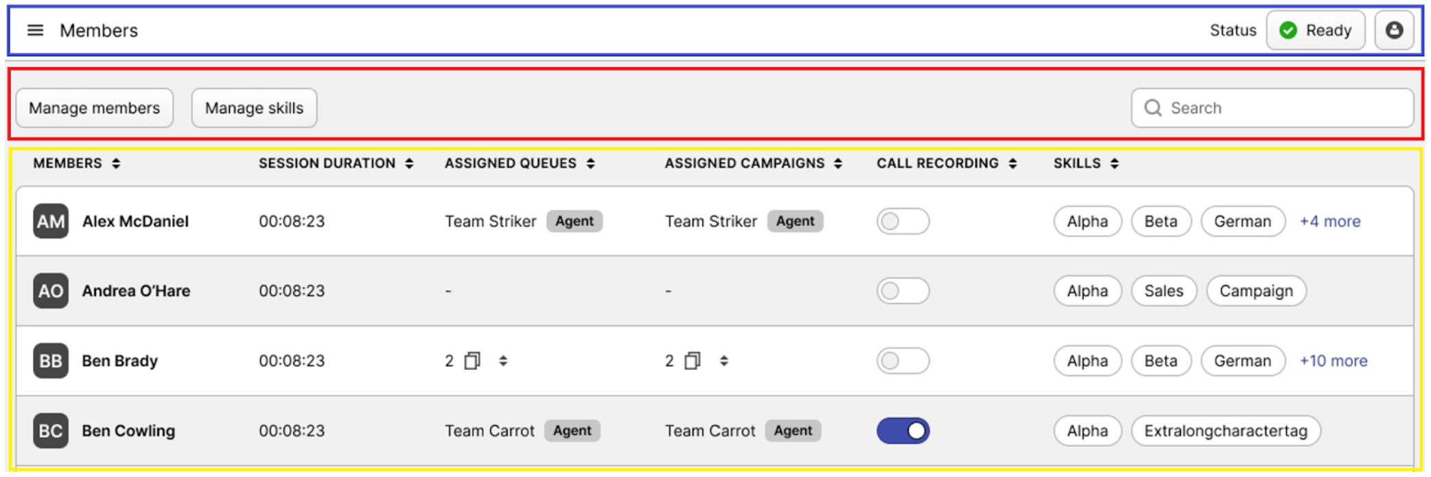 Member List (yellow rectangle): each call center member in the section is displayed as a record in the table. Each line contains useful information such as the call center member’s name, session duration, assigned queues and campaigns, their list of skills, and a toggle switch that enables call recording for all calls handled by that person.