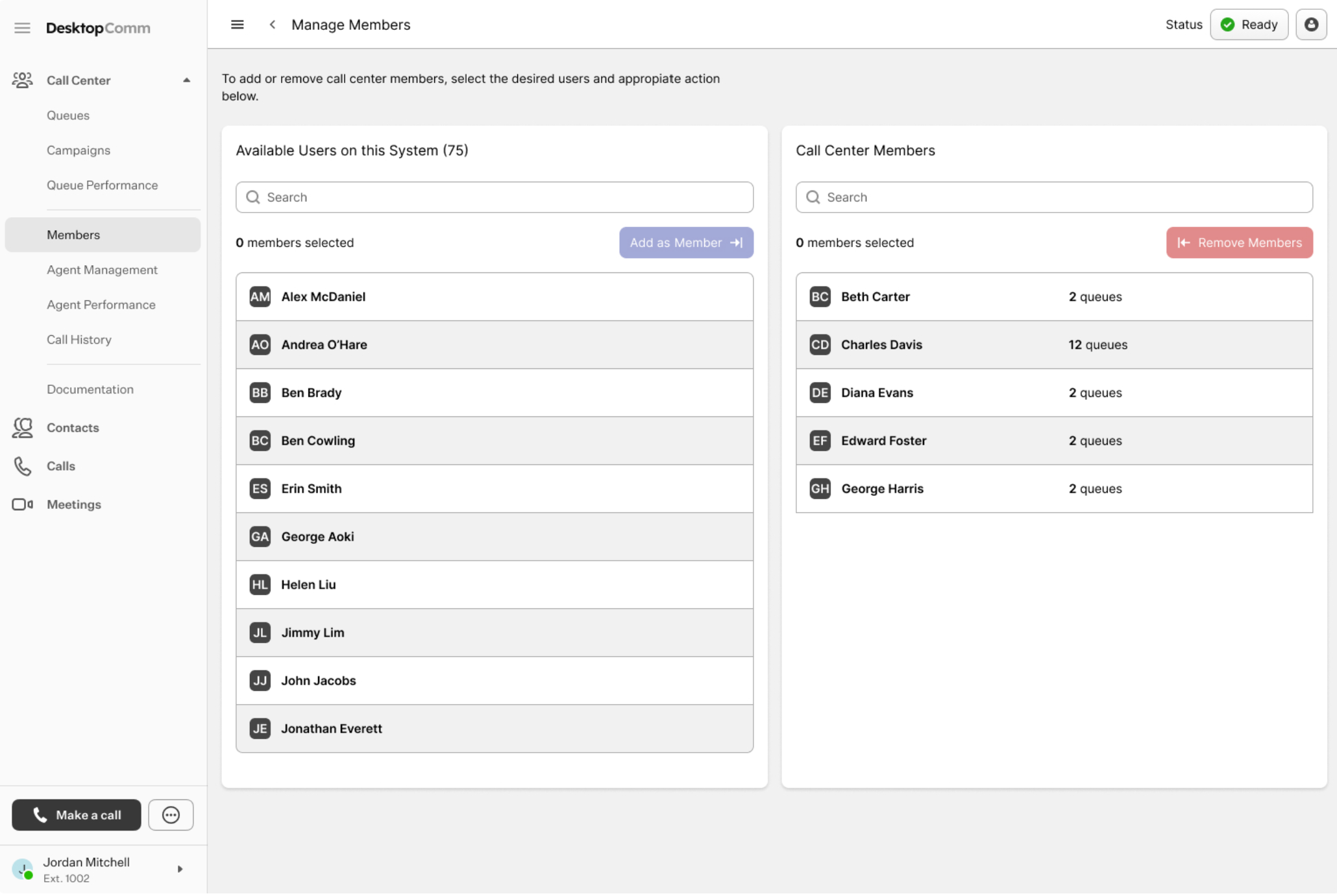 Here, you can manage the agents assigned to the call center. The agents in the left list represent all agents in the system, while the agents in the right list are assigned to this call center. To add a member, select an agent from the left list and click the “Add as Member” button. To remove an agent, select them from the right list and click the “Remove Members” button.