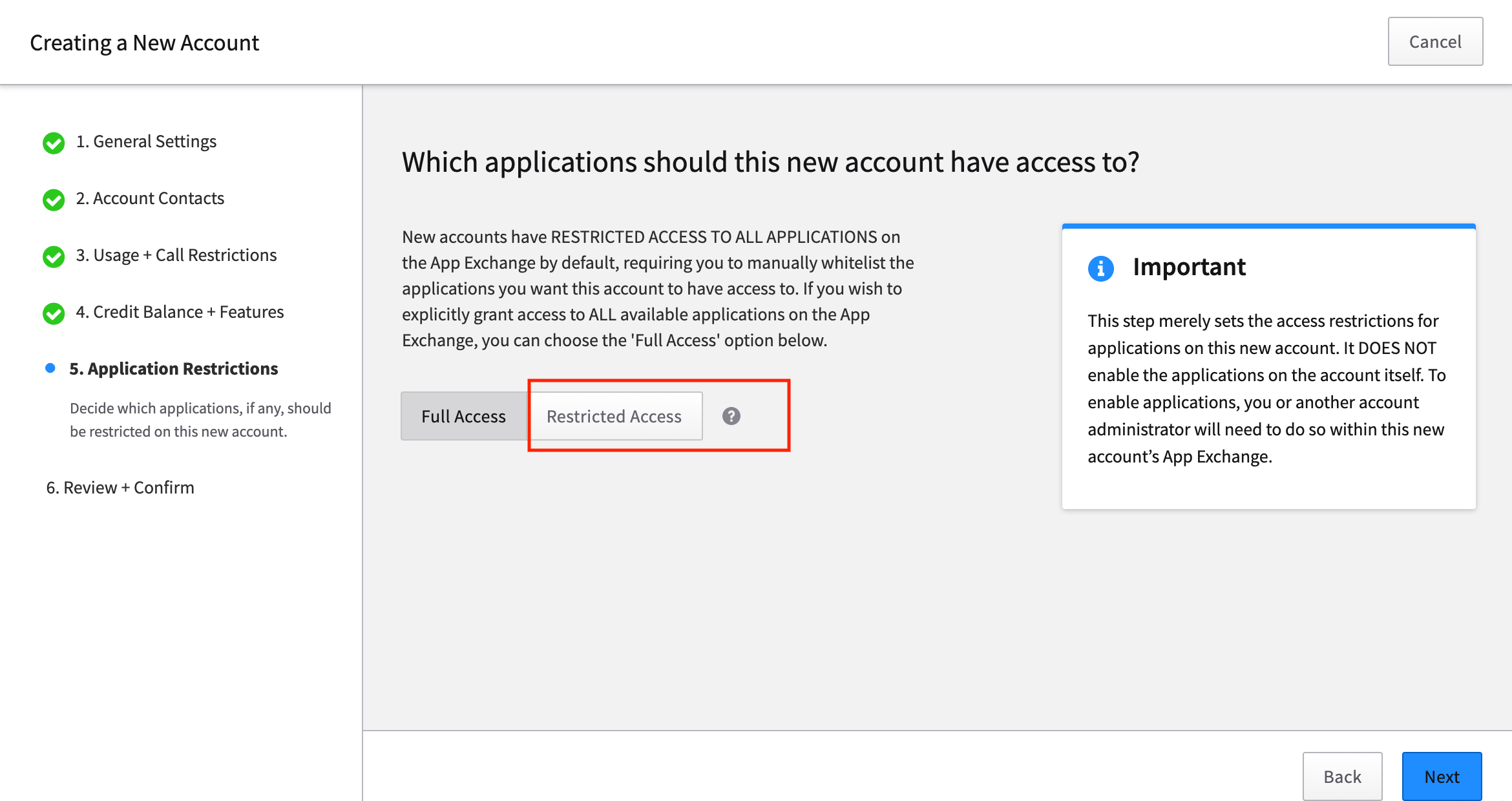 - If you select Restricted Access, you will need to manually add the applications you want to enable for this account.
