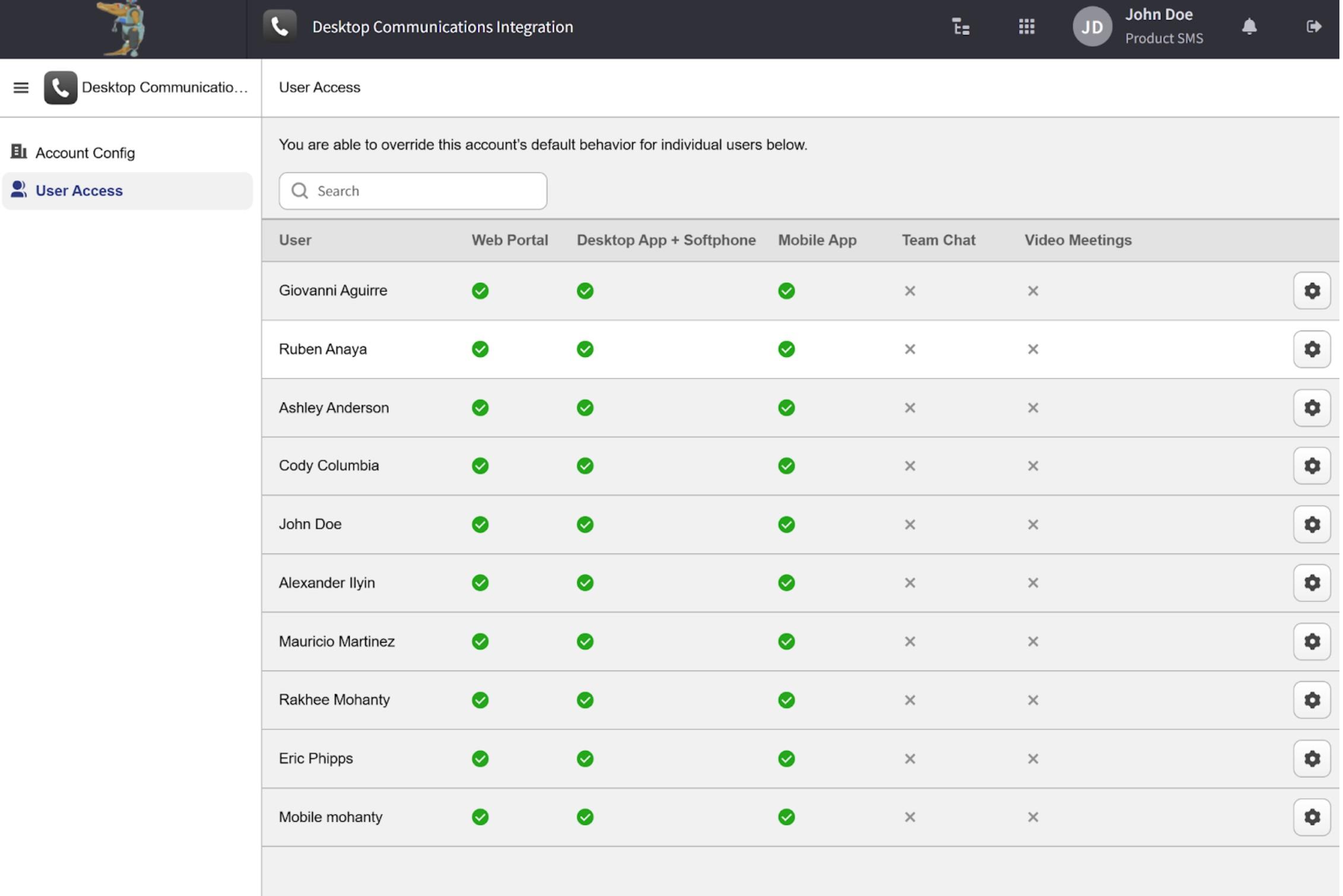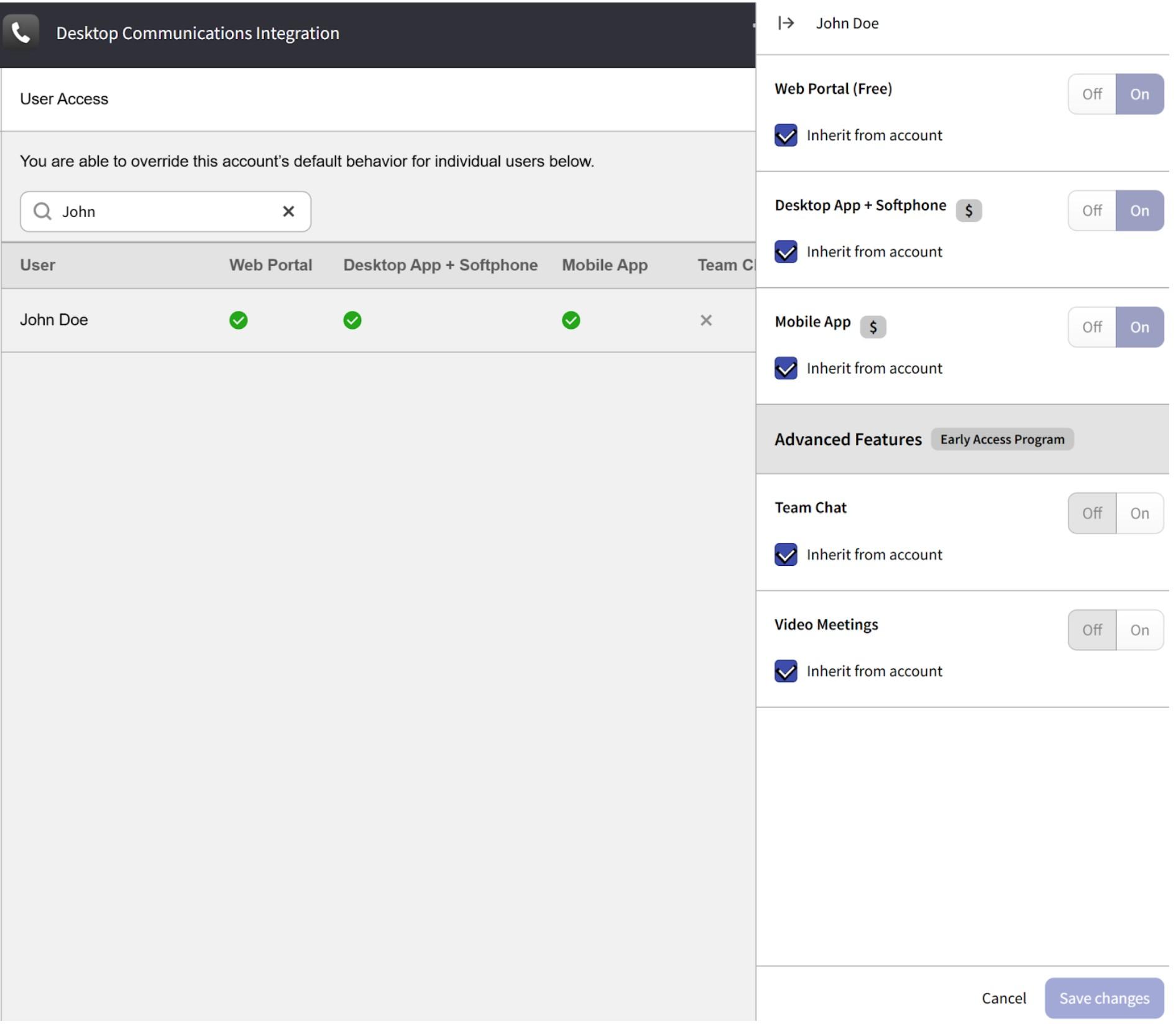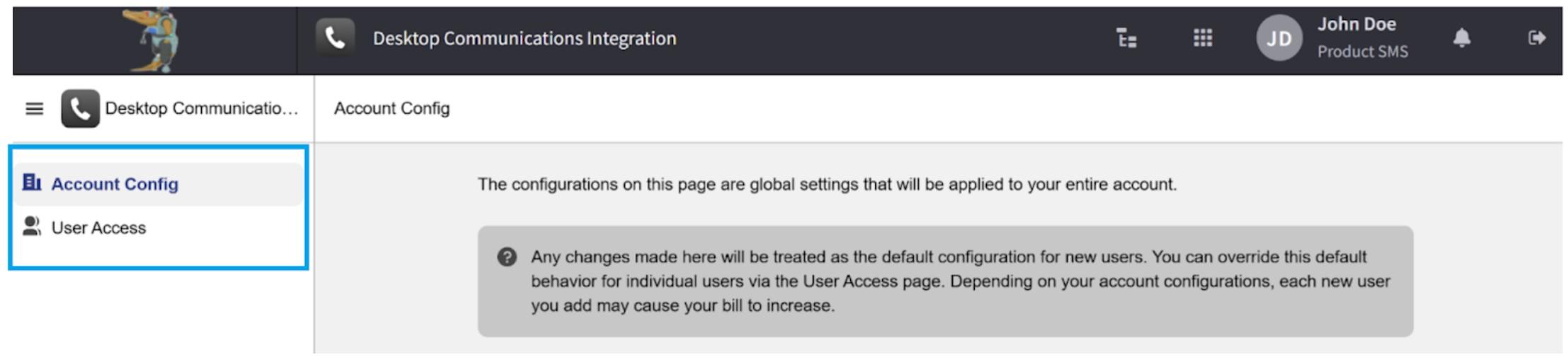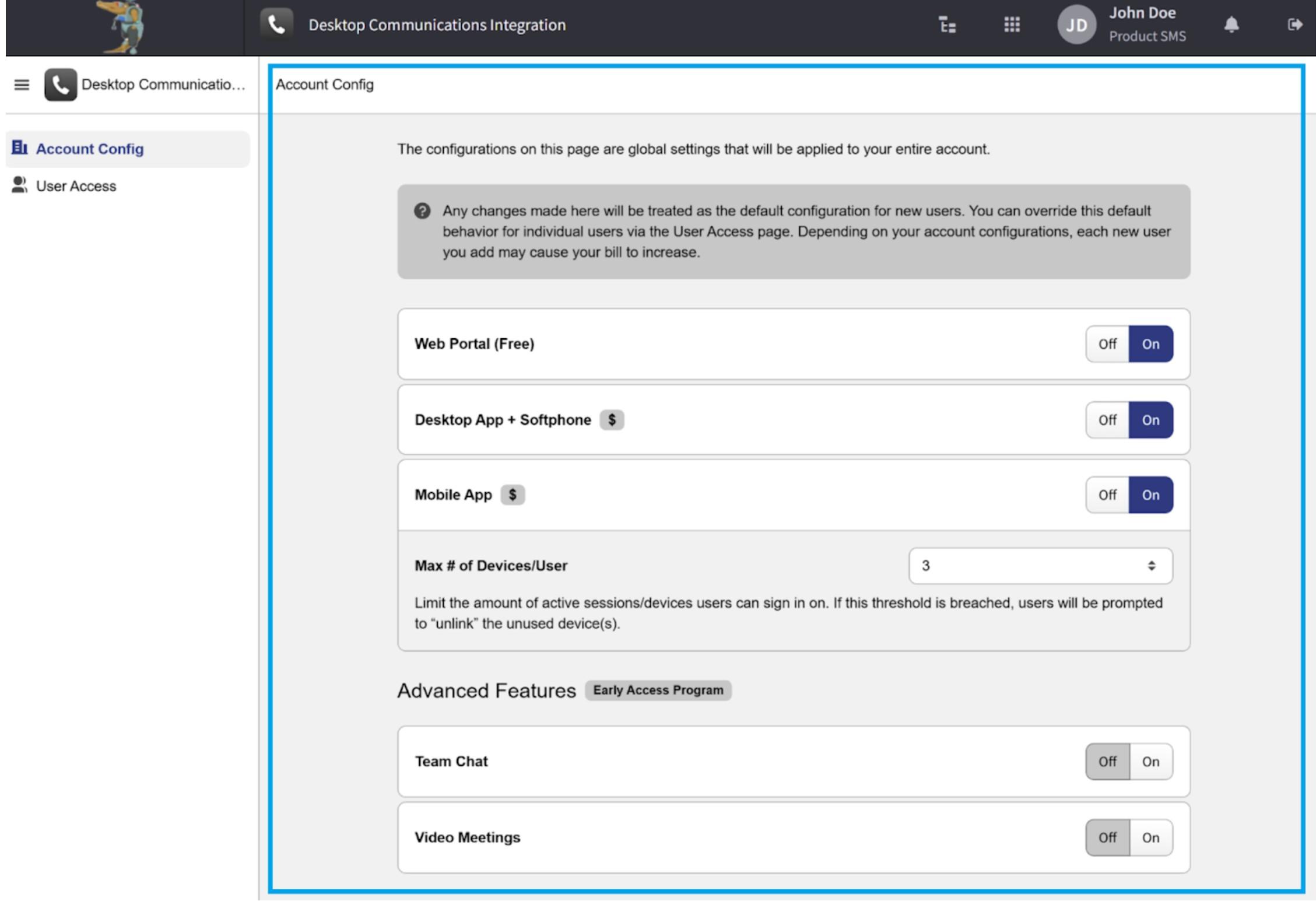 The Desktop Communications Integration App is built for simplicity and efficiency. It allows administrators to enable system features, applications, and web portal access at the account level, applying the same settings to all users, or at the user level, where custom settings can override the account-level configuration.
